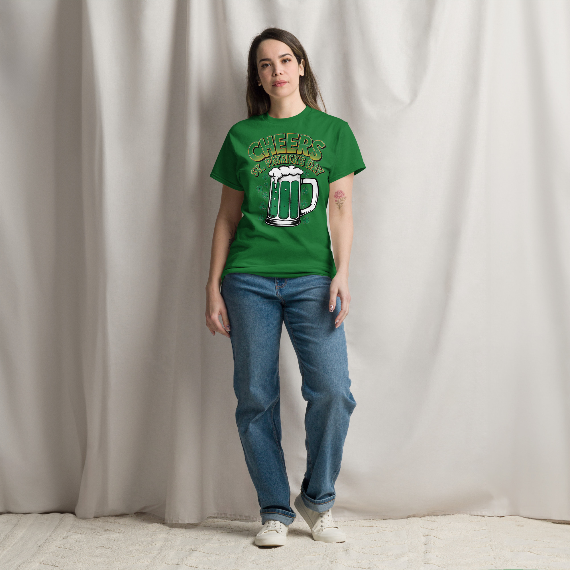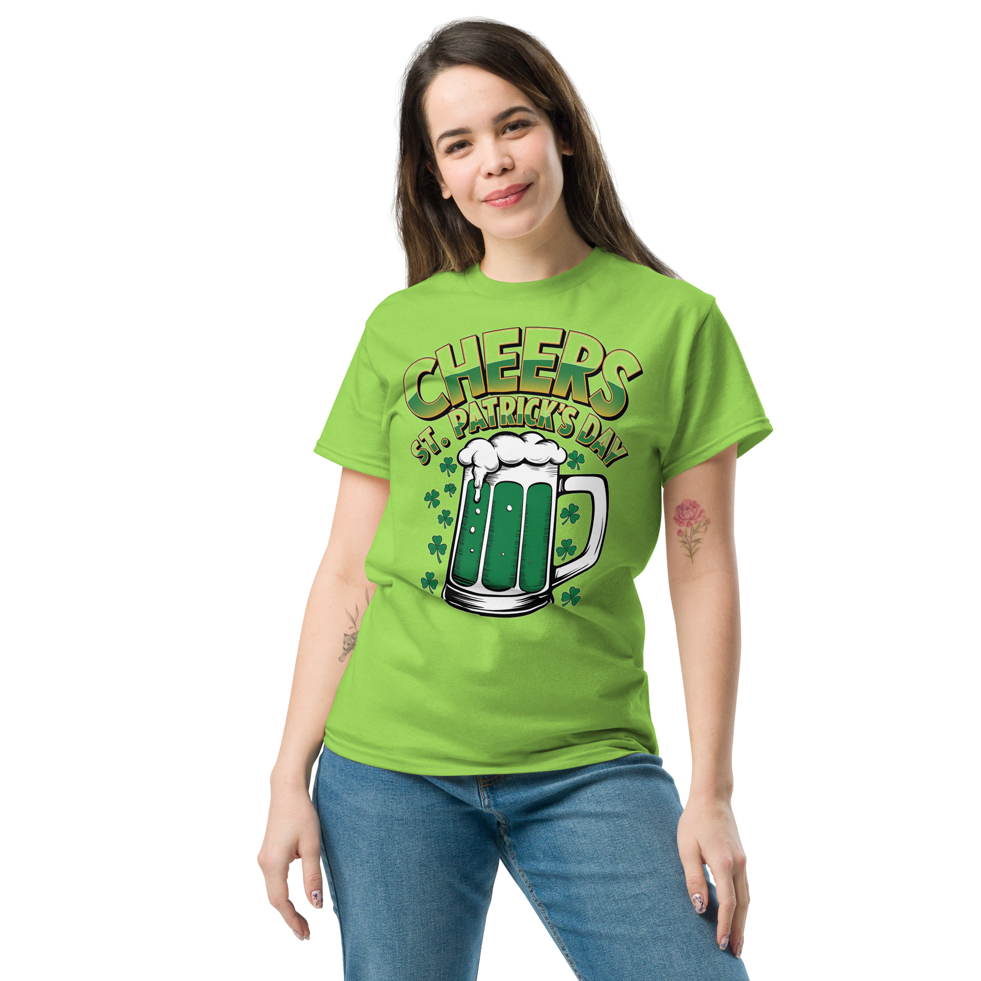 Get ready to celebrate in true Irish style with the Cheers St. Patrick’s Day Green Beer Shamrock Graphic T-Shirt. Featuring a bold green beer mug overflowing with foam and surrounded by lucky shamrocks, this design captures everything people love about St. Patrick’s Day—fun, friendship, and festive vibes.