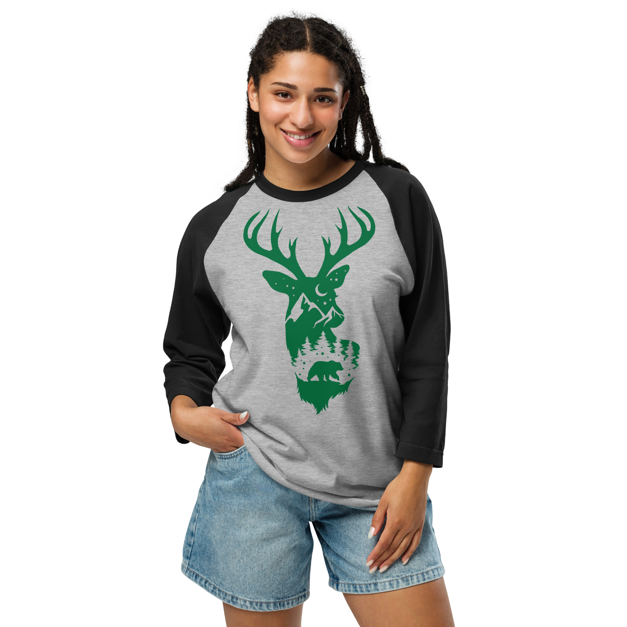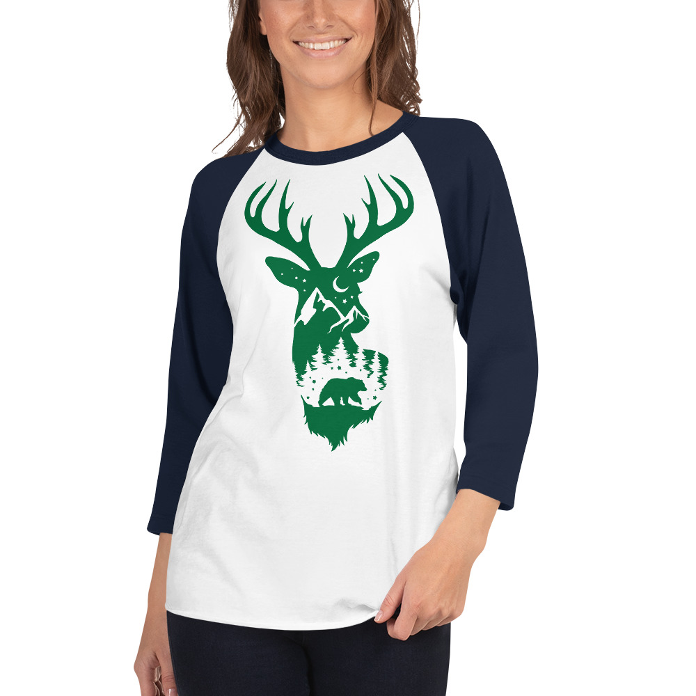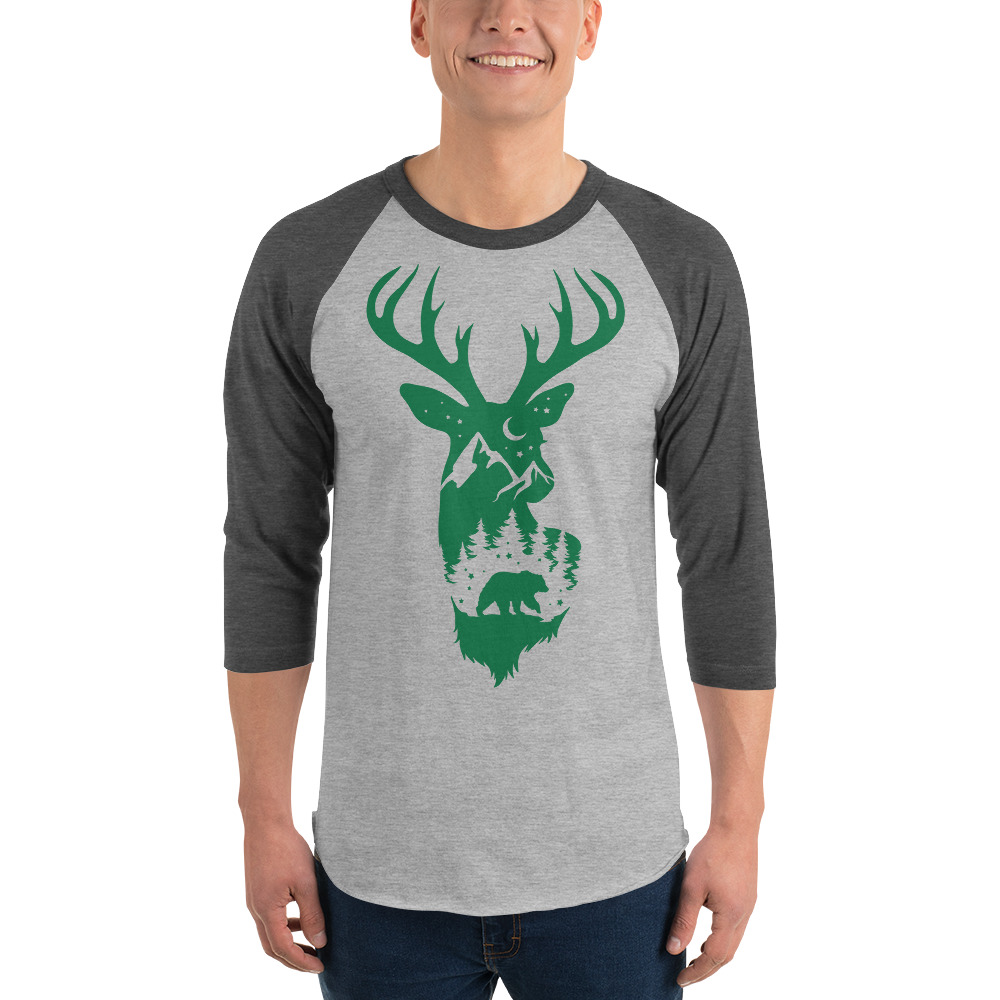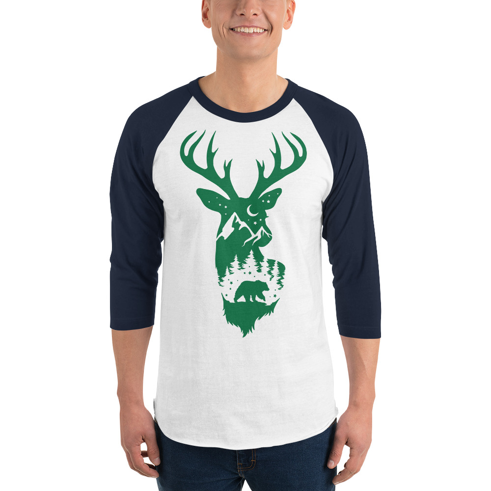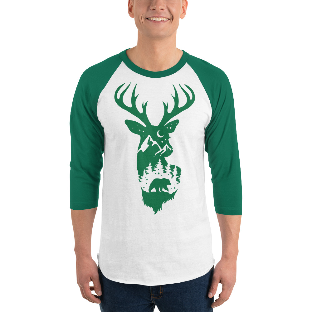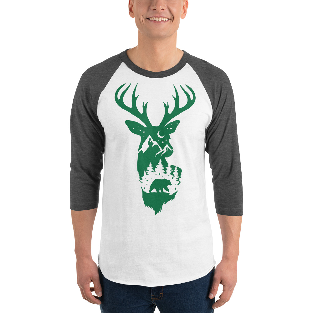 Embrace the spirit of the wild with the Majestic Forest Deer Mountain Bear Nature 3/4 Sleeve Raglan Shirt. Inspired by the deep connection between wildlife and untamed landscapes, this striking design features a powerful deer silhouette blended with mountains, pine forests, and a roaming bear beneath a crescent moon. It’s a bold visual tribute to nature’s strength, balance, and quiet mystery.
